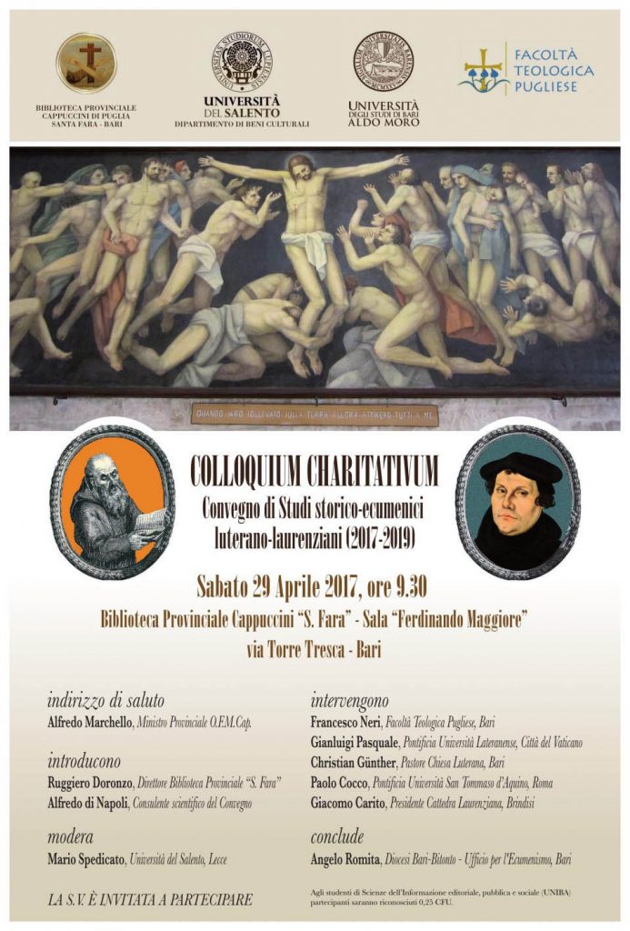 Su invito del Ministro Provinciale dei Cappuccini di Bari P. Alfredo Marchello, sabato 29 Aprile 2017 il Prof. Gianluigi Pasquale OFM Cap., Docente nella Pontificia Università Lateranense e nostro Socio Ordinario, ha tenuto la seconda Conferenza dal titolo “La teologia della storia nella dottrina di San Lorenzo da Brindisi. In un margine di confronto con Martin Lutero” al “Colloquium Charitativum”: Convegno di Studi storico-ecumenici luterano-laurenziani (2017-2019) svoltosi nella “Biblioteca Provinciale Cappuccini “Santa Fara””, con il Patrocinio delle Università di Bari, del Salento, della Facoltà Teologica Pugliese e della Provincia dei Cappuccini di Bari. Si tratta di un primo passo di un più vasto programma che porterà alle celebrazioni del IV Centenario dalla morte di San Lorenzo da Brindisi (1619-2019) che culminerà nel 2019.